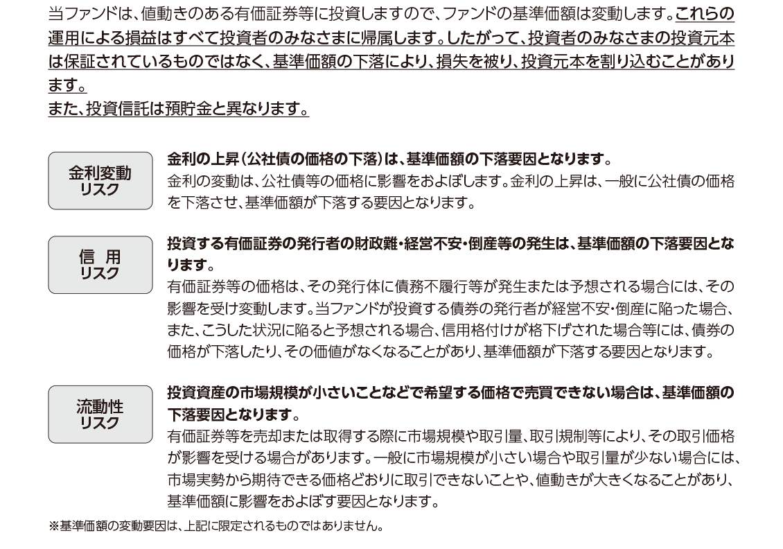投資信託は、株式や債券等の値動きのある有価証券(外貨建資産には為替リスクもあります)に投資をしますので、市場環境、組入有価証券の発行者に係る信用状況等の変化により基準価額は変動します。このため、購入金額について元本保証および利回り保証のいずれもありません。