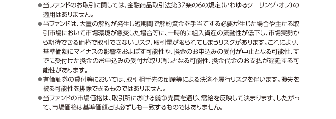 運用状況によっては、分配金額が変わる場合、あるいは分配金が支払われない場合があります。投資信託は、預金等や保険契約ではありません。また、預金保険機構および保険契約者保護機構の保護の対象ではありません。加えて証券会社を通して購入していない場合には投資者保護基金の対象にもなりません。購入金額については元本保証および利回り保証のいずれもありません。投資した資産の価値が減少して購入金額を下回る場合がありますが、これによる損失は購入者が負担することとなります。