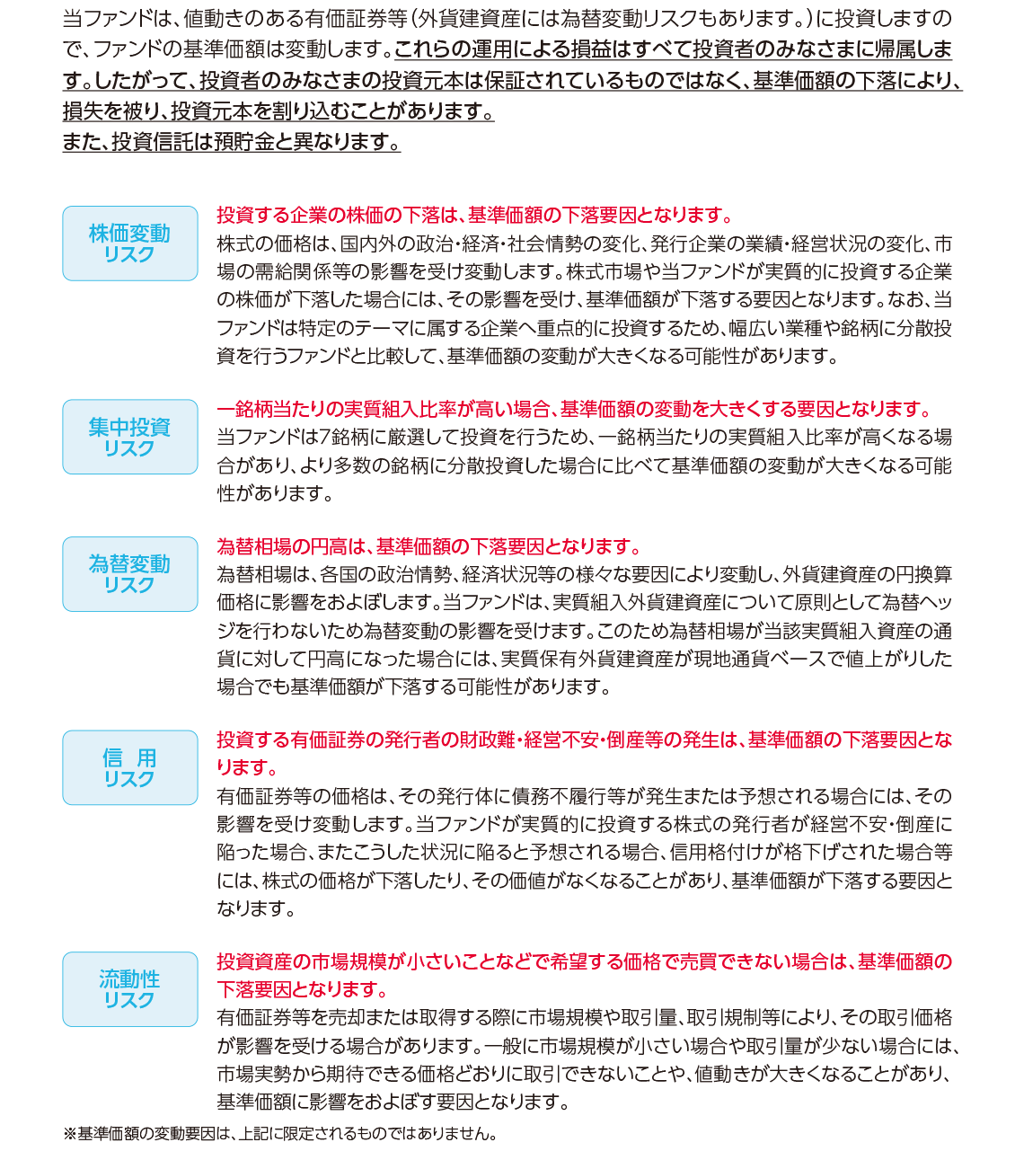 投資信託は、株式や債券等の値動きのある有価証券(外貨建資産には為替リスクもあります)に投資をしますので、市場環境、組入有価証券の発行者に係る信用状況等の変化により基準価額は変動します。このため、購入金額について元本保証および利回り保証のいずれもありません。