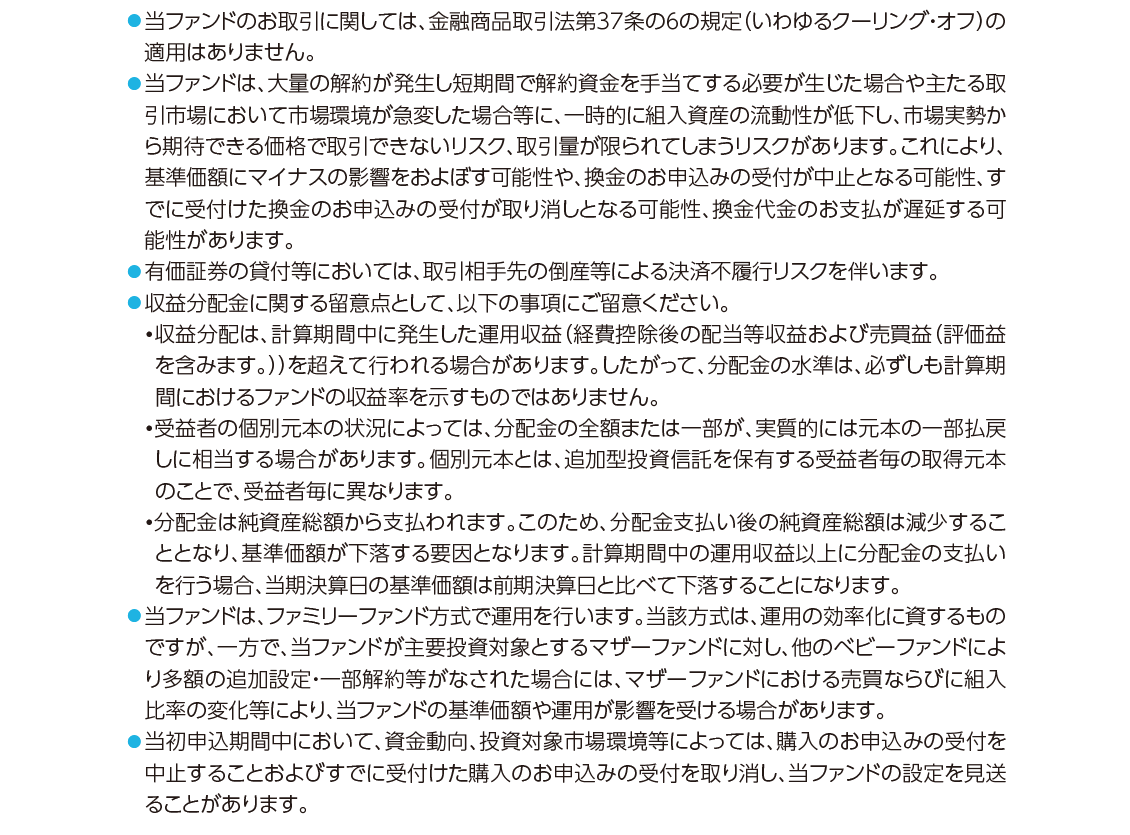 運用状況によっては、分配金額が変わる場合、あるいは分配金が支払われない場合があります。投資信託は、預金等や保険契約ではありません。また、預金保険機構および保険契約者保護機構の保護の対象ではありません。加えて証券会社を通して購入していない場合には投資者保護基金の対象にもなりません。購入金額については元本保証および利回り保証のいずれもありません。投資した資産の価値が減少して購入金額を下回る場合がありますが、これによる損失は購入者が負担することとなります。