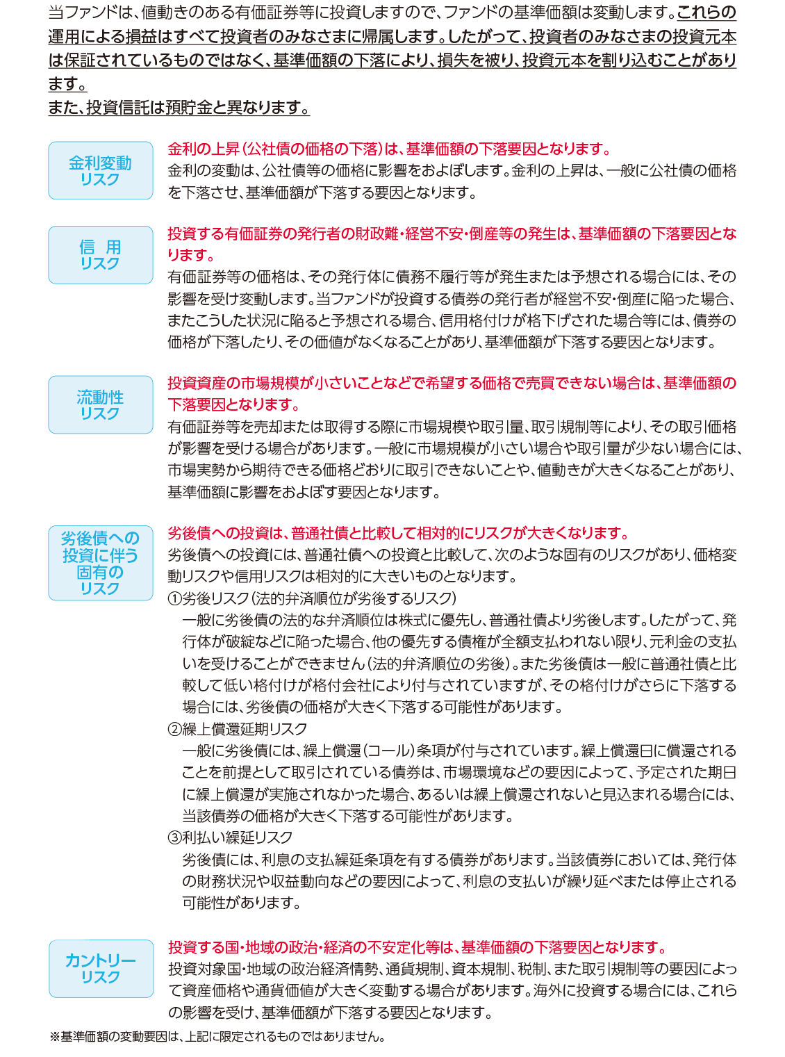 投資信託は、株式や債券等の値動きのある有価証券(外貨建資産には為替リスクもあります)に投資をしますので、市場環境、組入有価証券の発行者に係る信用状況等の変化により基準価額は変動します。このため、購入金額について元本保証および利回り保証のいずれもありません。