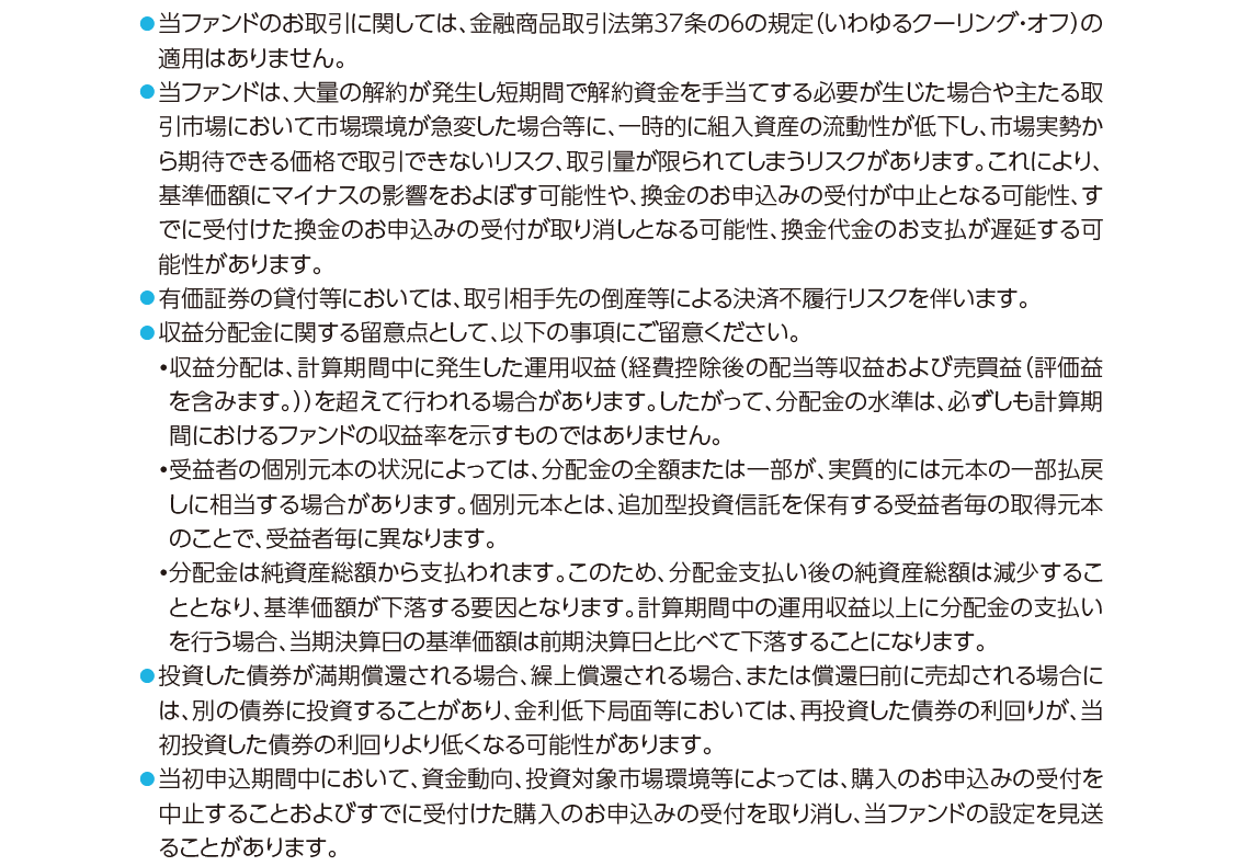 運用状況によっては、分配金額が変わる場合、あるいは分配金が支払われない場合があります。投資信託は、預金等や保険契約ではありません。また、預金保険機構および保険契約者保護機構の保護の対象ではありません。加えて証券会社を通して購入していない場合には投資者保護基金の対象にもなりません。購入金額については元本保証および利回り保証のいずれもありません。投資した資産の価値が減少して購入金額を下回る場合がありますが、これによる損失は購入者が負担することとなります。