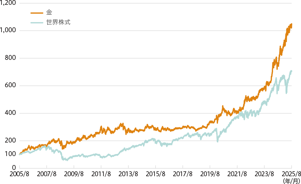 金への投資が注目を集めている理由の1つとして、長期に渡る堅調なパフォーマンスがあります。過去20年間では、金の価格は世界株式と同様に上昇しています。