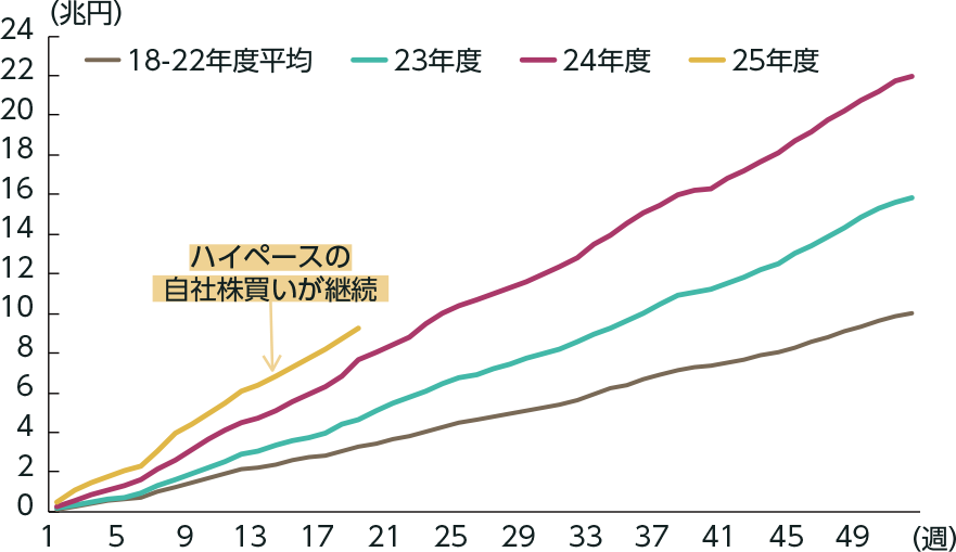 2024年度、上場企業による自社株買いは過去最大を更新し、2025年度は2024年度を上回るペースで増加しています。この自社株買いの動きは、①で記載した東証による資本コストや株価を意識した経営の実現に向けた対応要請等によって加速しています。投資家としては、株価上昇に繋がりやすいことがメリットとなり、企業としては、投資家からの信頼が高まり長期的な経営戦略が実行しやすくなります。